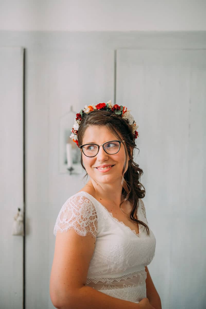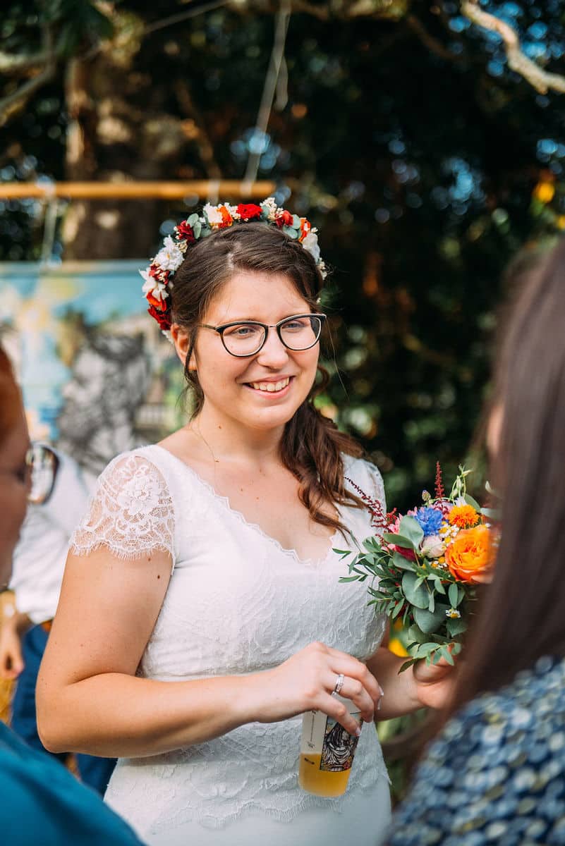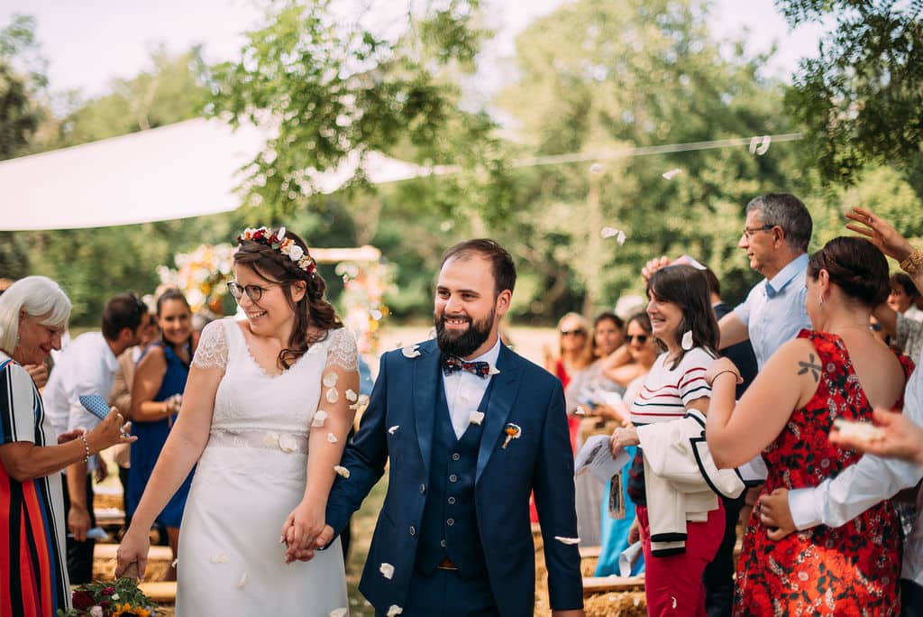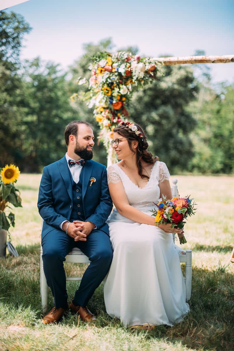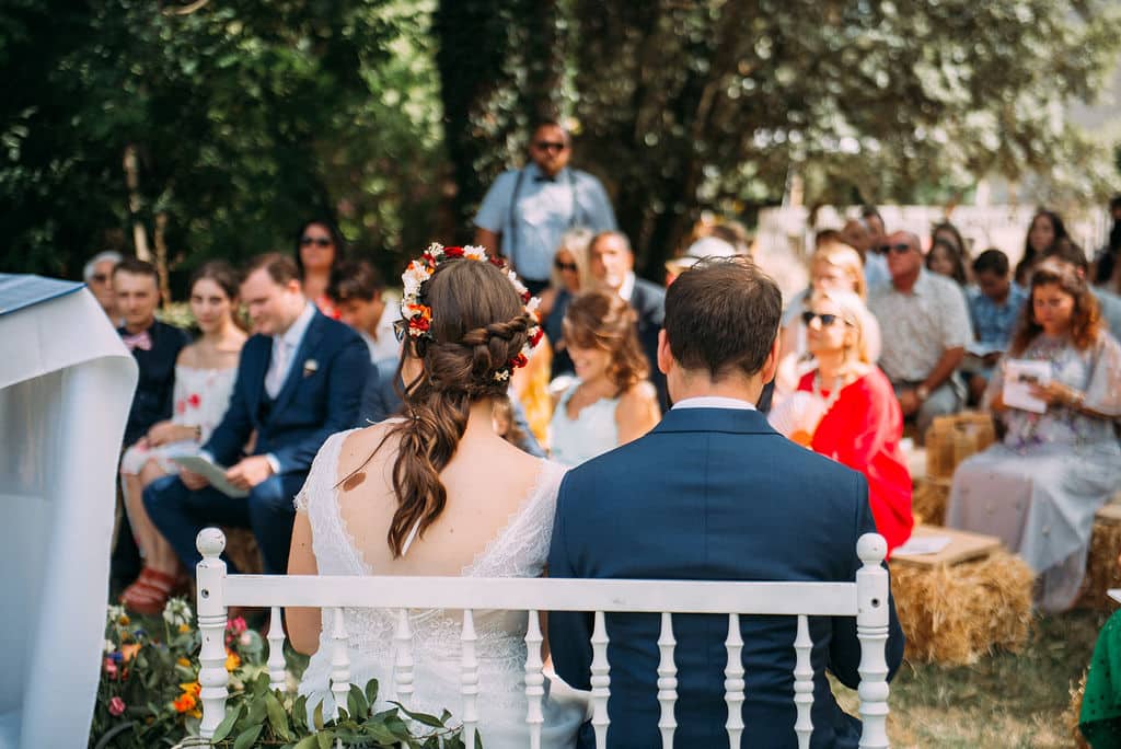 La journée entière a été riche en émotions. Mais si je devais choisir un moment, ce serait la cérémonie religieuse. Celle-ci s’est déroulée en extérieur. Je ne tenais pas vraiment à me marier dans une église et nous avions loué un lieu tout à fait adapté pour accueillir la cérémonie. Le plus compliqué était de trouver un prêtre qui accepte de nous unir dans ces conditions. Finalement, cela n’a pas été trop difficile et nous avons trouvé un aumônier tout simplement parfait ! Drôle, attachant, souriant. Il a donné un ton si unique à notre cérémonie. Tous les invités ont apprécié.