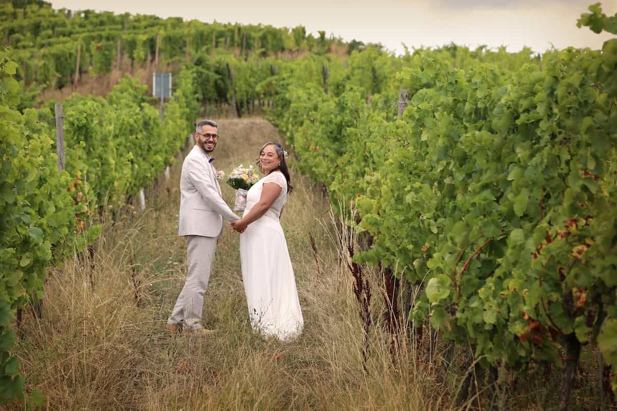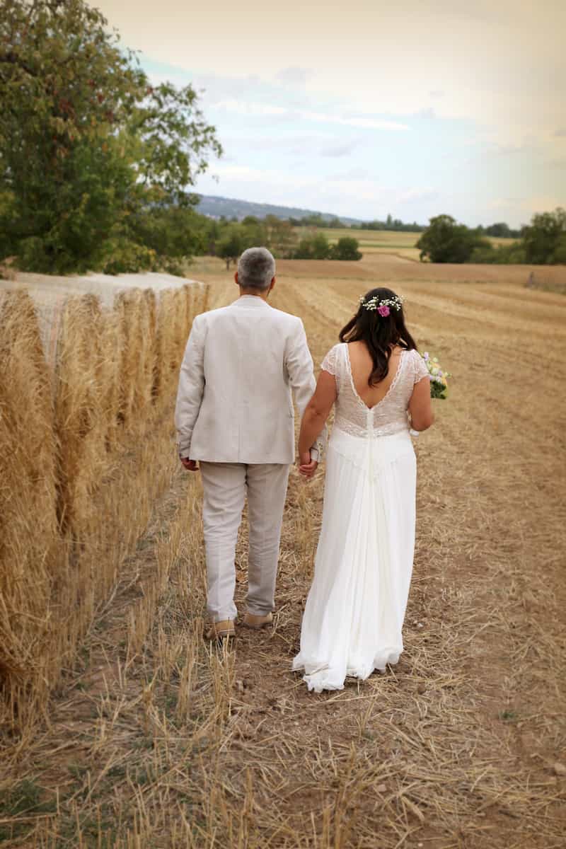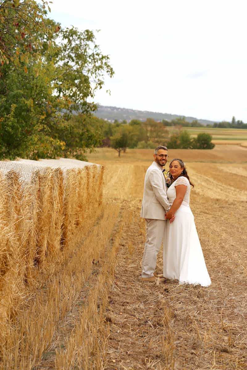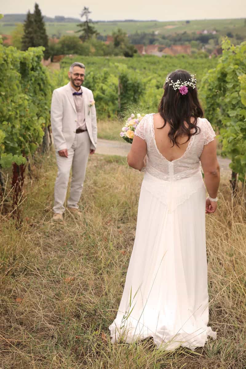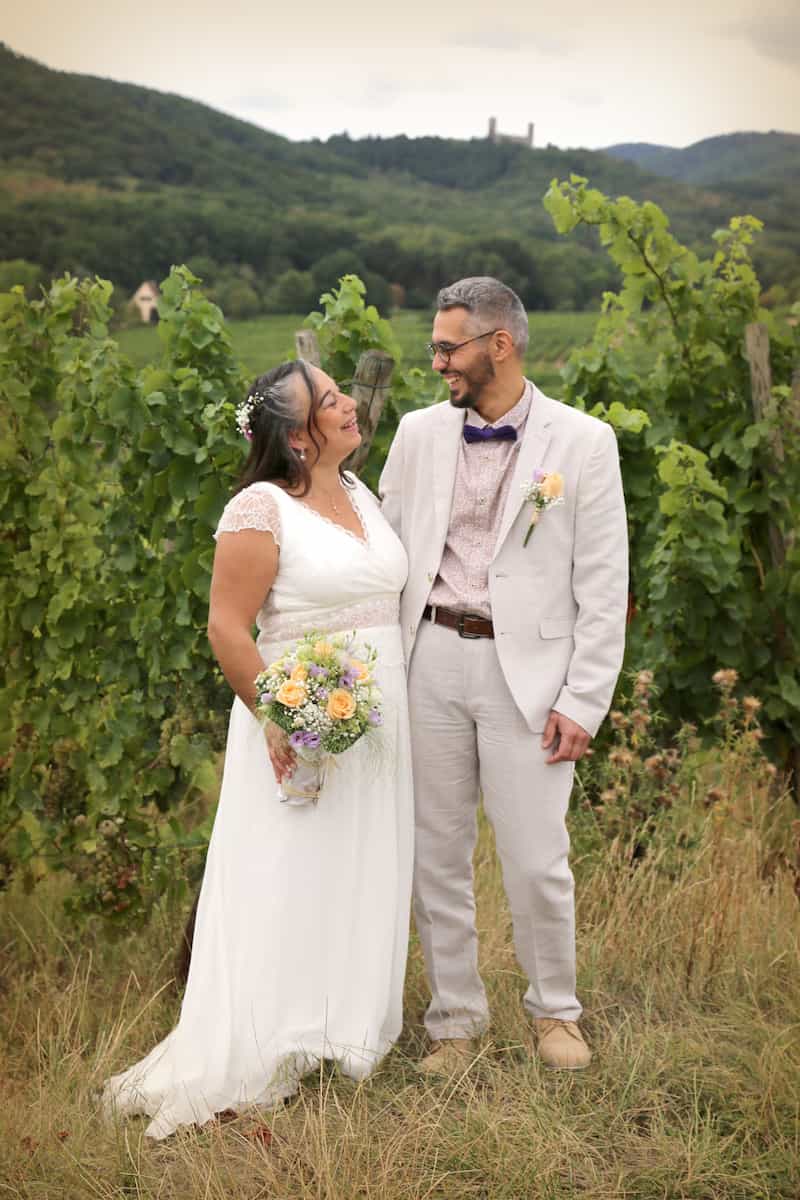 Plusieurs moments m’ont marqué : j’aurais du mal à dire lequel m’a marqué le plus. D’abord, le moment des photos entre nous 2. J’ai beaucoup apprécié. Prendre ce temps là, avec mon mari, partager ces moments ensemble… Ensuite, au moment où je rentrais dans le jardin avec mon père, j’étais très ému (étant donné qu’au départ, lui et ma mère ne devaient pas venir à cause du covid, ils habitent une autre région, assez loin. Finalement, ils m’ont fait la surprise d’être présents). Et le dernier point marquant lorsque mes témoins ont parlé, c’était aussi très émouvant, très marquant.