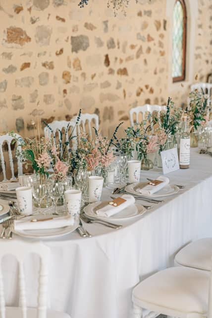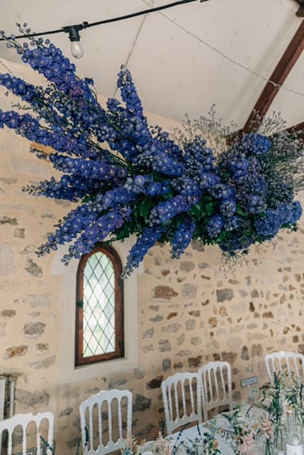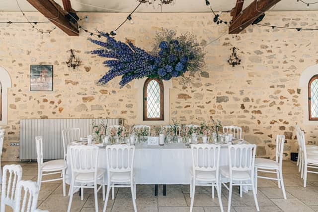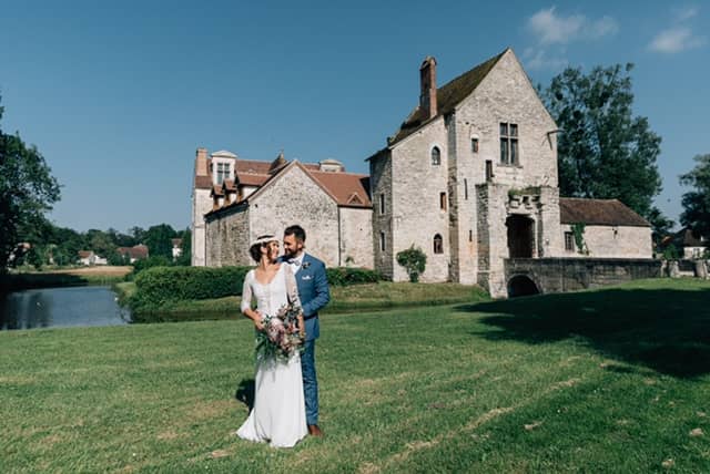 Éternelle célibataire, autonome indépendante et une pointe rêveuse, le destin a décidé tout d’un coup de tout bousculer… Sur un passage piéton place des ternes, je croise le plus beau regard de ma vie, qui se pose sur moi, et d’un sourire, d’un échange de numéro, nous voilà 2 puis 3! Le rêve se poursuit, un genou à terre, une jolie bague et une robe à choisir!!!!!!!! Très vite une tendance pour les mariages, bohèmes, romantiques se dessinent. Une grande ferme, un chapiteau dans un champ?? Mais non il nous manque de l’eau, ce qu’on aime tous les 2, l’océan, les plages, les plongées sauf que l’on se marrie en région parisienne! Le château de Pontarmé est parfait, intimiste avec une salle de réception magnifique, sa cours intérieure, les douves tout autour et son saule pleureur pour nous accueillir. Ça sera du bohème chic ! Nous y sommes ! Le jour J ! Tout se met en place… la robe est parfaite, que la fête commence! Aude rose, notre fleuriste a enfin terminé sa composition florale principale, un magnifique bouquet aérien plein de volupté en bleu ocean intense!